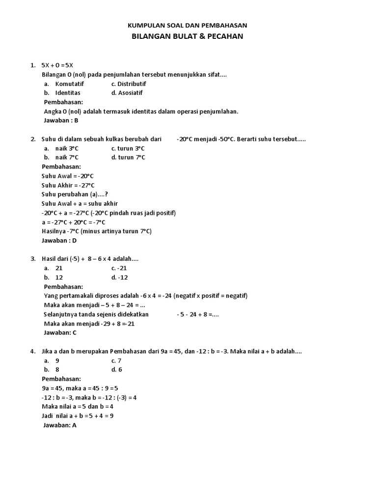 Contoh Soal Bilangan Bulat Dan Pecahan Kelas 7 Pengertian