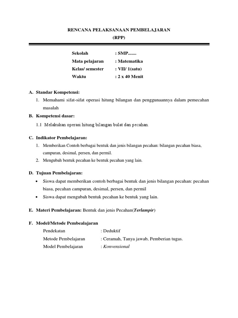 Rpp Matematika Berkarakter Bilangan Bulat Dan Pecahan 1
