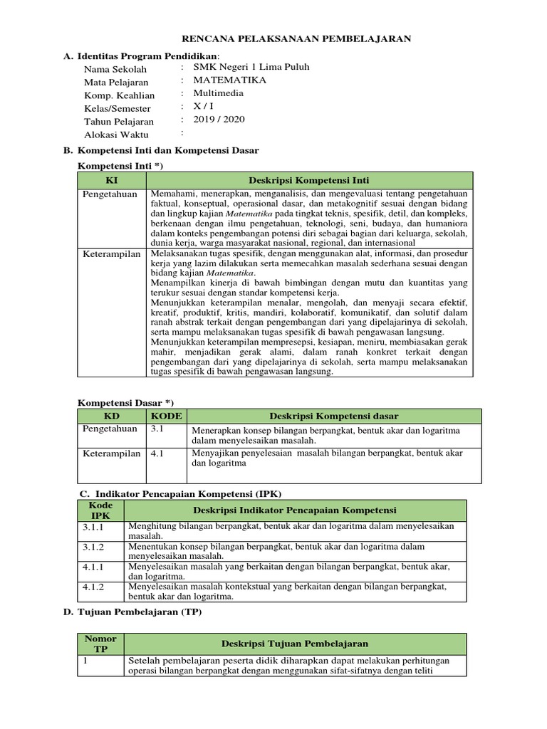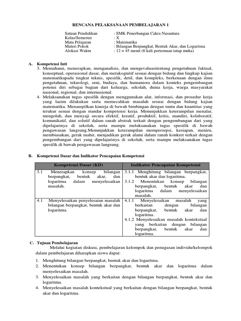 Rpp1 Bilangan Berpangkat Bentuk Akar Logaritma Docx