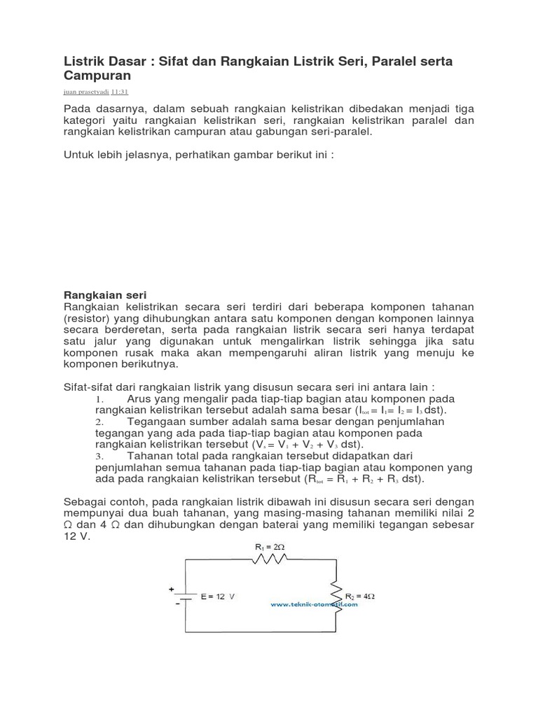 Rangkaian seri adalah rangkaian listrik yang terdiri dari dua buah lampu atau lebih yang disusun secara berderet atau berurutan. Saya mencoba membahas materi rangkaian listrik dengan harapan pemahaman peserta didik mengenai rangkaian listrik ini menjadi lebih baik. Pada bagian akhir diberikan contoh soal rangkaian listrik seri paralel dan campuran.