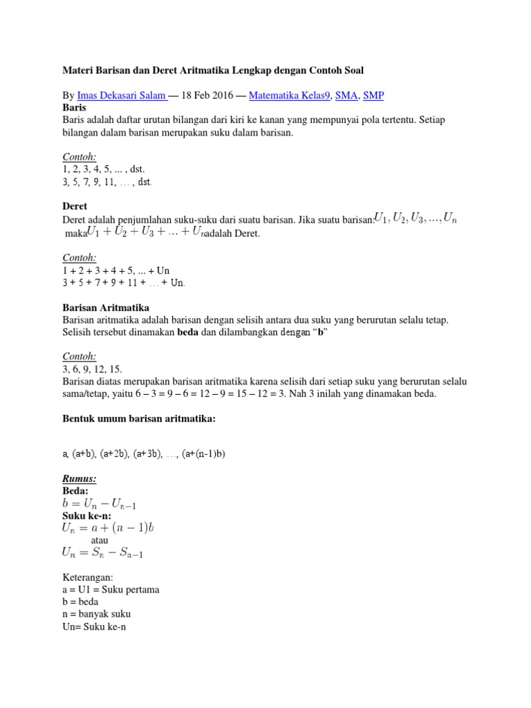 Contoh soal deret aritmatika sma. 2014 dan 2015 tercakup indikator menyelesaikan masalah barisan dan deret aritmatika geometri. Barisan aritmatika dan deret aritmatika pengertian barisan matematika yang dinamakan barisan dari bilangan real adalah susunan bilangan yang mempunyai sifat keturunan berpola unsur unsur suatu barisan disebut dengan istilah suku suku barisan dilambangkan dengan u 1 u 2 u 3 un. Materi skl kisi kisi ujian.