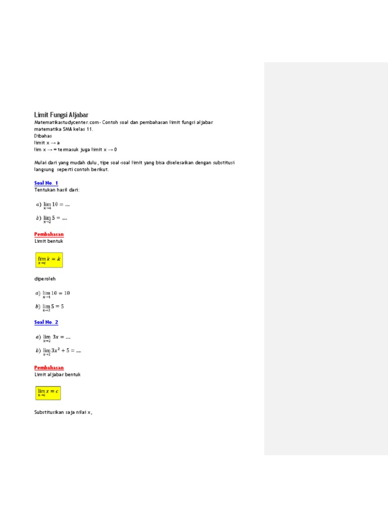 Contoh soal limit fungsi aljabar dan pembahasannya doc. Anda di halaman 1 dari 5. Soal soalnya dikumpulkan penulis dari berbagai sumber. Contoh soal dan pembahasan suku banyak dan teorema sisa matematika 11 sma.