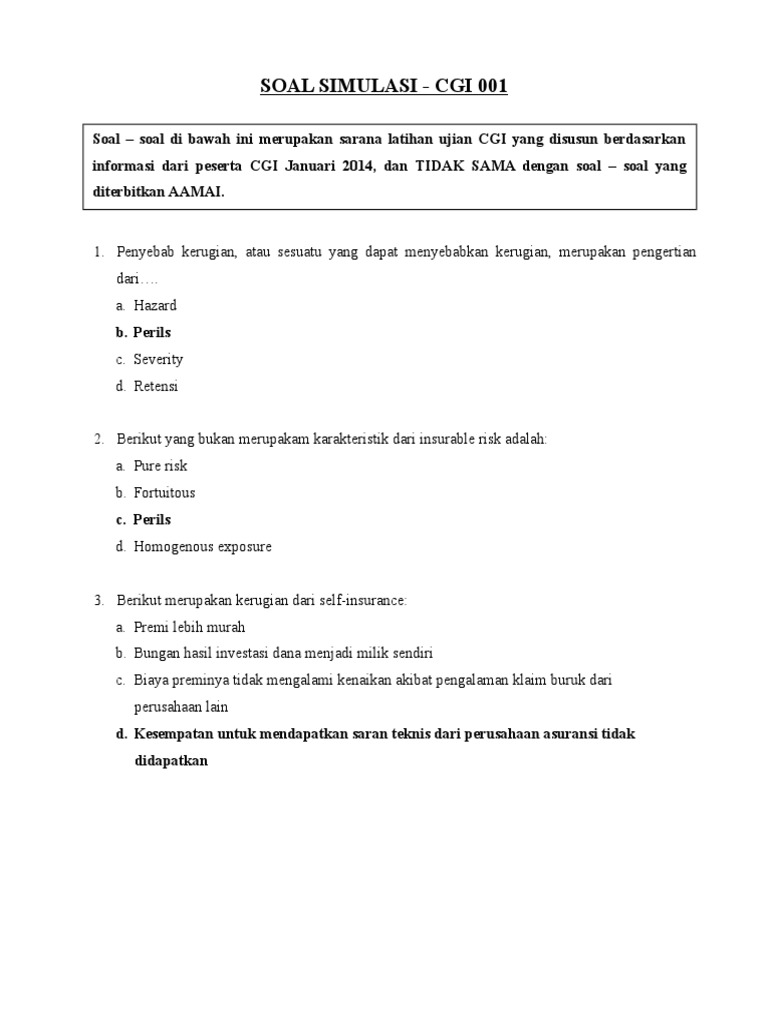 Pada soal ujian mencantumkan petunjuk atau tata cara menjawab pertanyaan Contoh soal dan jawaban hukum asuransi. Prinsip asuransi (001), yang diselenggarakan pada tanggal 16 maret 2. September 2013 disusun untuk ujian cgi sebagai syarat mengikuti serti kasi pro siensi lspp aamai 2014 disusun oleh: